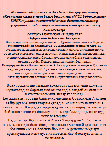 - Конкурстың талаптарына сәйкес келген үміткер Әдбрахмен А.А., музыка жетекшісіне Хайдарұлы А. денешынықтыру нұсқаушысына мединциналық картасының дайыне болуына байланысты бұйрық шығарылсын, жұмысқа қабылдау құжаттары әзірленсін.