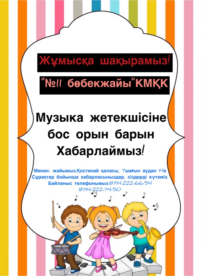 Қостанай облысы әкімдігі білім басқармасының «Қостанай қаласы білім бөлімінің «№11бөбекжайы» коммуналдық мемлекеттік қазыналық кәсіпорны 7-шағын аудан 14а мекен-жайында тәрбиеші қызметін атқаратын бос орынға конкурс жариялайды.