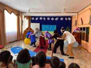 Кіші жас, ортаңғы, ересек топ тәрбиешілері ролдерге бөлініп «Бауырсақ», «Шалқан»,«Мақта қызбен мысық», «Қызыл телпек» ертегілерін қойса, мектепалды даярлық топ тәрбиешілері қуыршақ театырын қойды. Осы апталықтың соңғы күнінде педагогтар әр түрлі киіпкерлердің киімдерін киіп балалармен ойындар ойнап, флешмоп биледі.