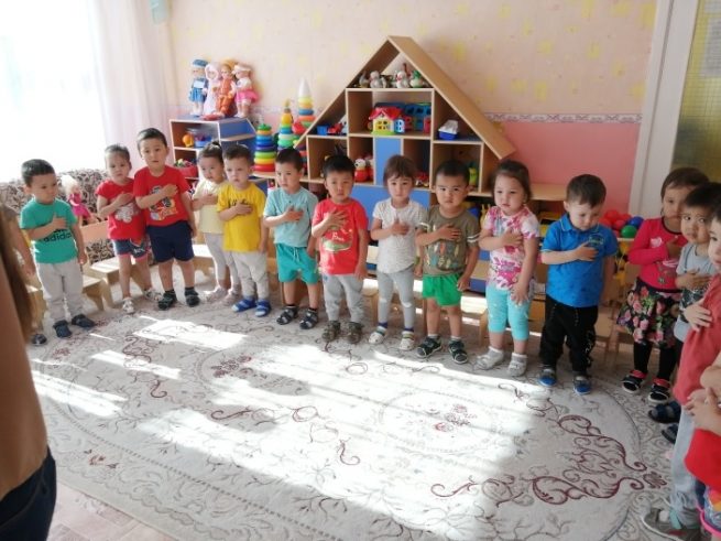 Осы атаулы мерекені біздің ұжымда белсенділік танытты. Бөбекжай-бақшаның басшысы бастаған педагогтар мен тәрбиешілер Қазақстан Республикасының ән ұнанын бірге шырқап, балаларға арнайы тәрбие сағаттарын жүргізді. Әр топ тәрбие сағатын Қазақстан Республикасының ән ұранымен бастап, рәміздерді көрсетіп ,түсіндіріп, тәрбие сағаттары түрлі дидактикалық ойындармен жалғасты.