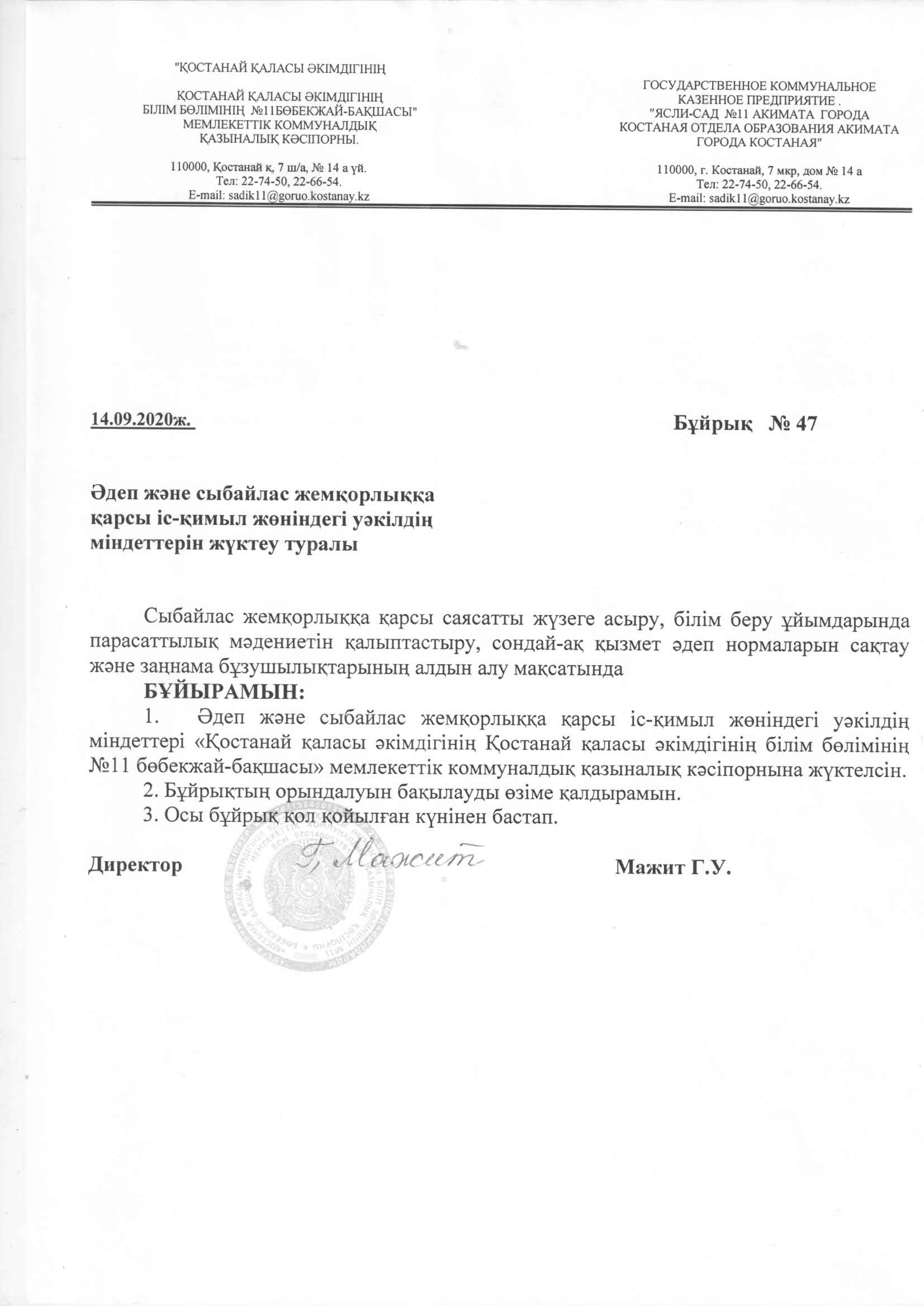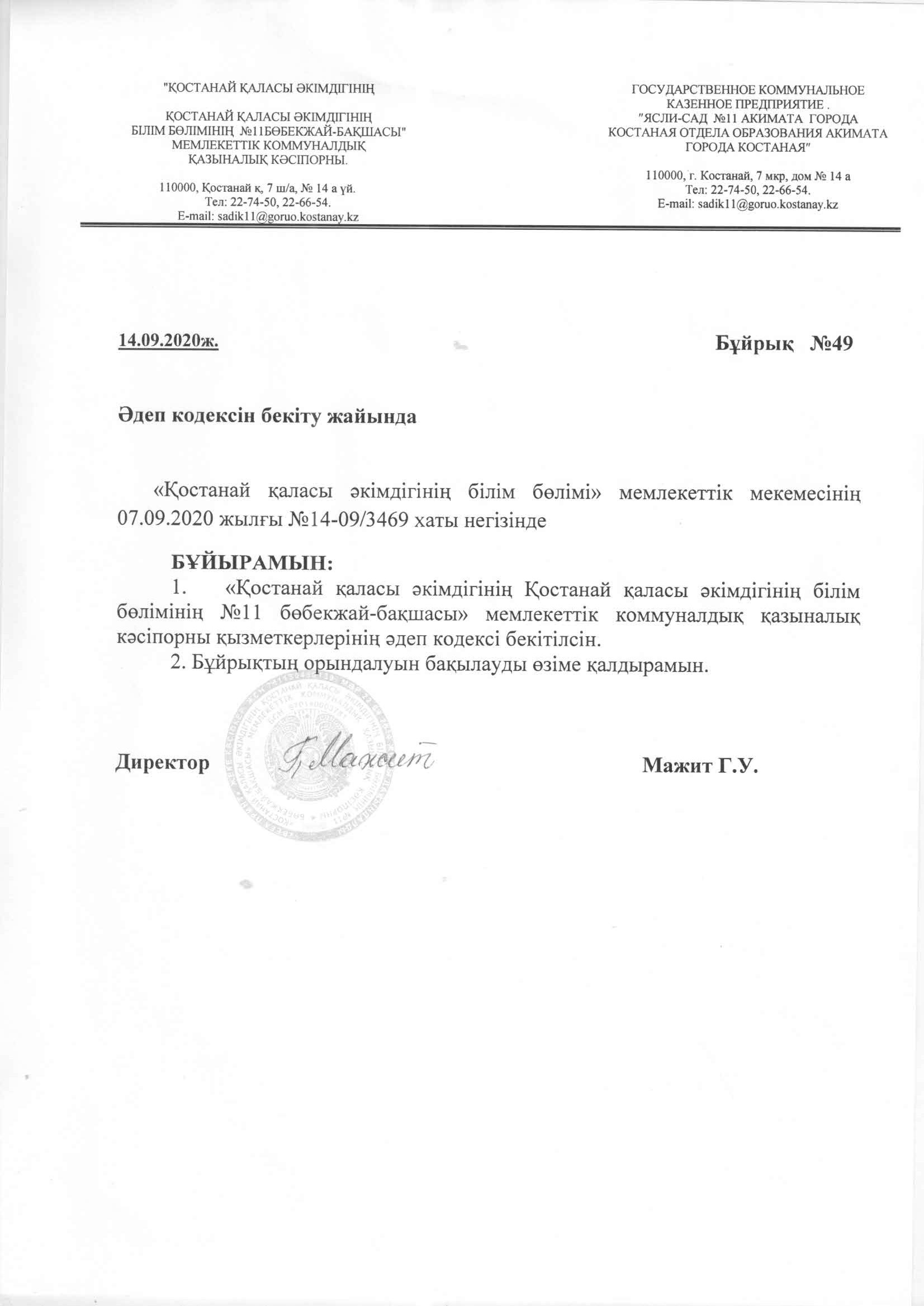 Акышова Актоты Ауданбековна - әдеп және сыбайлас жемқорлыққа қарсы іс-қимыл жөніндегі уәкіл Байланыс ақпараты: «№11 бөбекжайы» КМҚК, 7 шағын аудан, үй №14а Телефон: +7(7142)22-66-54 |